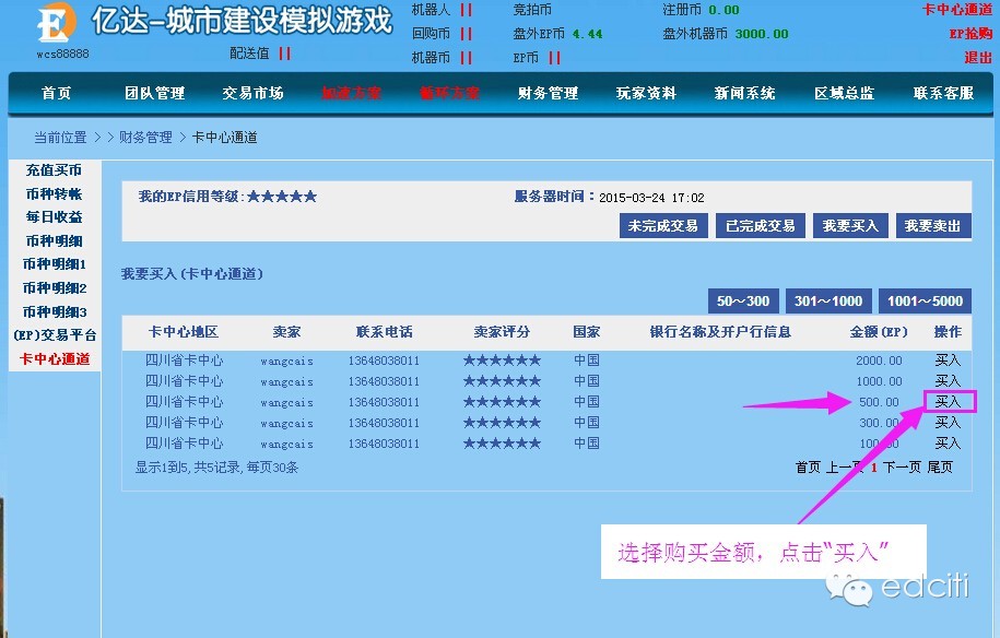 如图:选择自己需要购买的注册币金额,点击买入【提示:如果没有自己需要的金额,直接按照上面的电话联系卡中心购买即可】