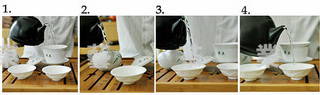 1-3.温杯:用75~85℃的开水,冲淋陶瓷盖碗,使其充分均匀受热。
