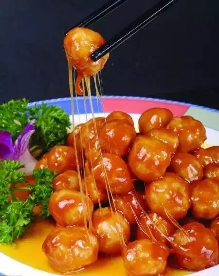 3.锅内放入少许清水,放入白糖炒制,待出丝时,即将丸子放入锅内颠翻,最后加入香蕉油、青红丝少许即成。
