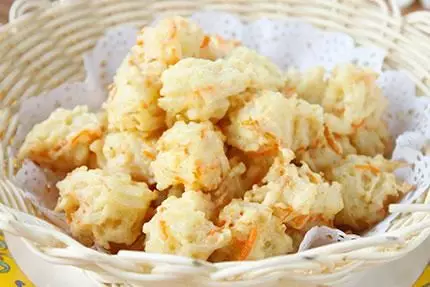 7、锅中做油,6成热时将食材挤成丸子逐个下锅炸成金黄色即成。ps:1、面粉要一点一点的加入,以免一次加多影响成品的口感。