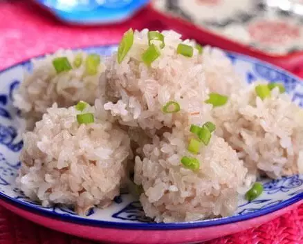 3.蛋黄外裹肉泥,然后沾满糯米;