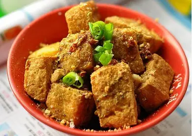 6、将汁淋在炸好的豆腐块上拌匀或沾食。