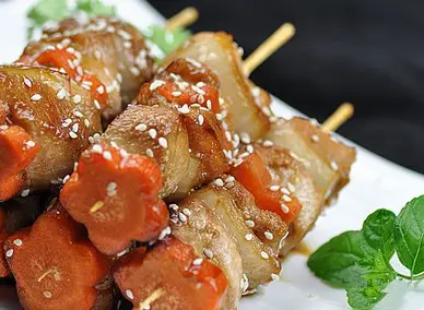 10、将腌渍好的鸡肉串起来,洋葱、胡萝卜和鸡肉分割穿插。