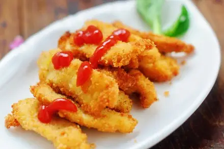 7、倒入花生油,小火烧热油,加入鸡柳,炸至金黄捞出控油即可。吃的时候配上番茄酱味道更好。