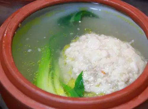 3.砂锅放清水(如果有清汤更好哈)用白菜叶垫底,把肉泥团成大丸子放进砂锅
