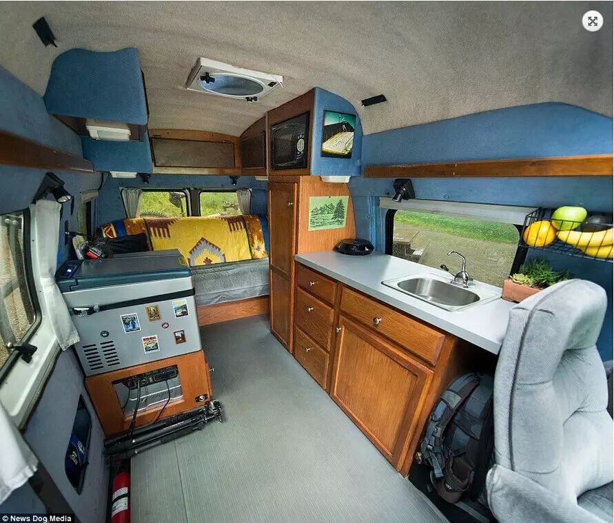 说起Travis 的房车,其实只是一辆旧车改造而来的,这辆1994的道奇箱型车原来的主人是Travis 的奶奶,或许她当时也不会想到,这辆旧车日后陪着孙子一起踏上了去往远方的旅途。Travis花了三个月的时间将这辆旧车改造成了现在的样子,厨房、卧室一应俱全。