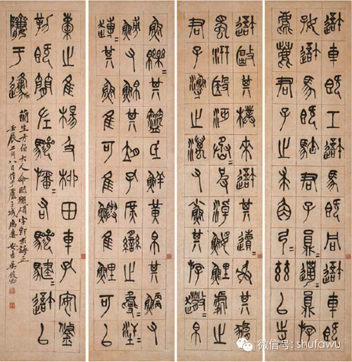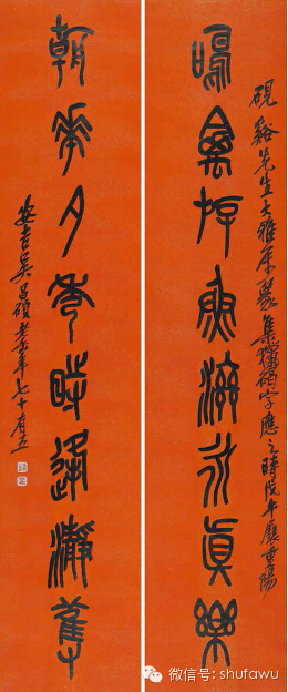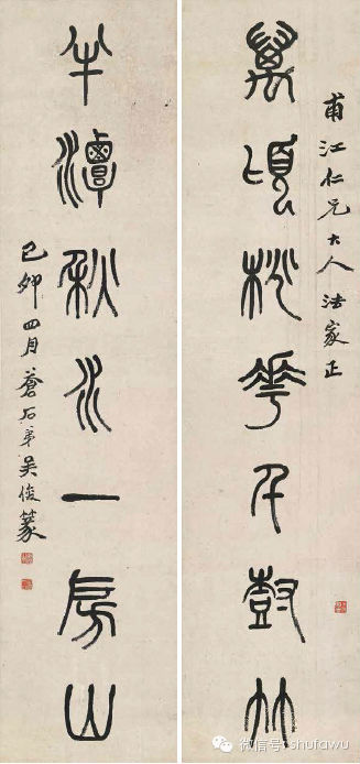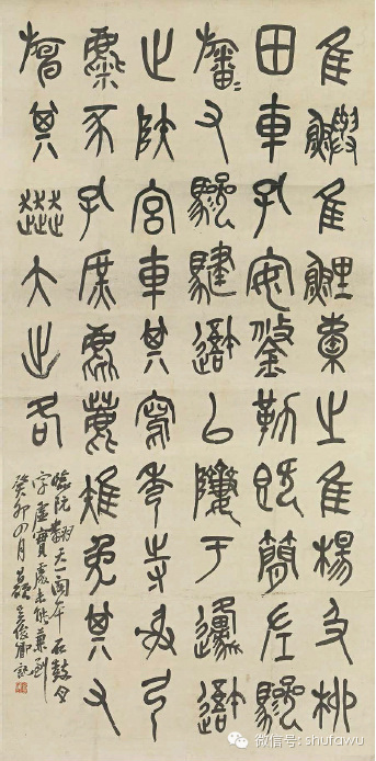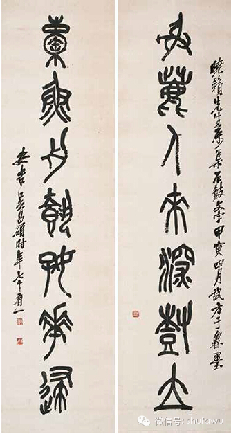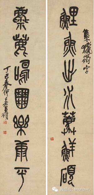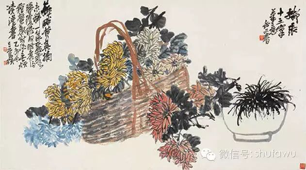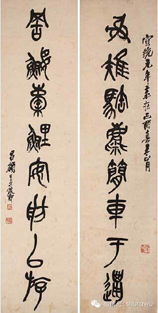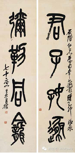 吴昌硕 (1844-1927),初名俊卿,初字香朴、香圃,又字苍石、仓石、昌硕,-一作昌石,号缶庐。浙江安吉人,寓居上海。1913年被公推为西泠印社首任社长。诗书画印博采众长,自成一家,被誉为四绝,为纵跨近、现代的杰出艺术大师。书法初师颜真卿,后法钟繇、王羲之,得力于石鼓文,笔力遒劲,气势磅礴。篆刻钝刀直入,苍劲雄浑。他将书法、篆刻的行笔、章法、体势融入绘画,形成独特画风,对后人产生极大影响。著有《红木瓜馆初草》、《元盖庐诗集》、《缶庐诗》、《缶庐别存》、《缶庐集》、《缶庐印存初集》4册等。吴昌硕一生酷爱梅花,逝后安葬于余杭超山,以梅为伴。解放后,杭州、安吉、余杭上海等地建有五处吴昌硕纪念馆(室)。