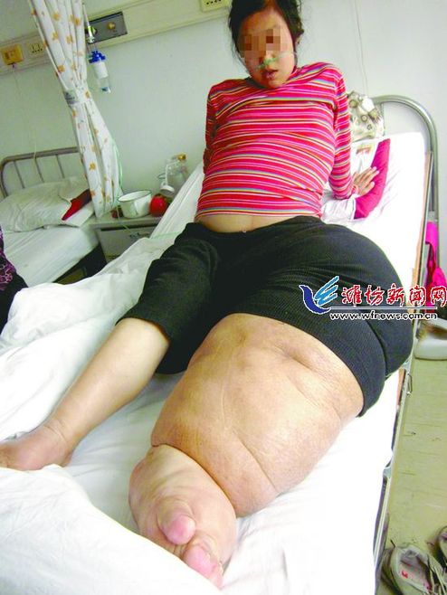 大象腿:新余32岁的胡金香左腿是条“大象腿”,比常人腿粗3倍,且时常疼痛,流出脓液,并引发高烧,她常常痛不欲生,但多年来却一直找不到病因.