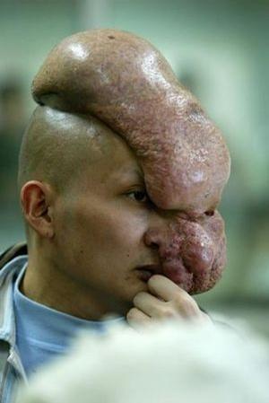 狮面人:南阳小伙杨会民4岁时,左眼皮上长了一个绿豆大的小疙瘩,此后小疙瘩不断增大,到8岁时,疙瘩的直径已达到3厘米,额头左侧也开始凸出,最后成了今天这个样子。