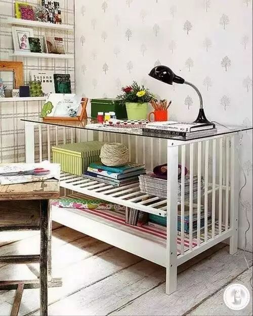 将婴儿床的床板提高一格,其次并拆除一旁的护栏,小小婴儿床瞬间变成时尚简约的办公桌、书桌...摆上小盆栽,瞬间弥漫田园清新之风。看到这些婴儿床变成的桌子,是不是觉得作者是多才多艺的人呢!