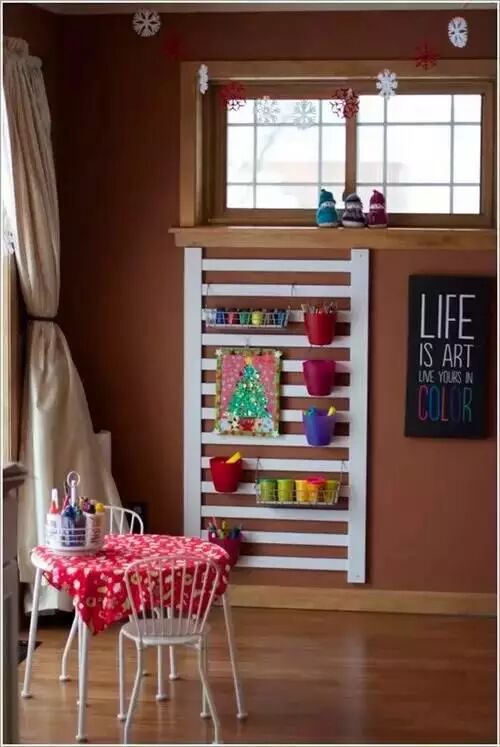 ▼将小床改造成桌子,上面加一层黑板桌面,孩子们可以随意在上面涂鸦,写写画画。