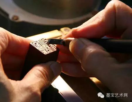 但事实上,因每个人的习惯不同,其实并无固定的最佳执刀之姿。笔者觉得运用最自如的执刀姿势既非类似握毛笔也非类似握硬笔,而是介于两者之间,冲切皆然。故治印者不必拘泥,可因人、因时、因材,选择最具力度的执刀手法即可。怎样才能使执刀手法最具力度?通常来讲,如果是选择虚掌的握笔式手法,应注意将力量注入指尖,力求掌虚指实;而选择实掌的握拳式,则需团紧五指,将力量凝聚掌间,方能在运刀中势如破竹。另外,无论选择哪种执刀法,握刀都宜低不宜高,高易重心不稳,低则凝心聚力。