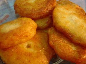 8、在下油锅前将土豆饼表面裹一层蛋液,逐个入油锅,并不时翻面,直到略漂起,表面呈金黄色时,捞起沥干油分。