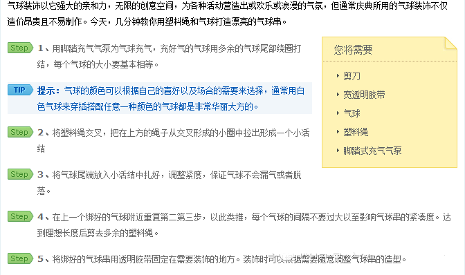 气球,通过多变的色彩组合,生动的造型设计,用气球编织成各种造型烘托欢乐气氛,来装饰点缀各种喜庆活动的场合。无论何种场合活动,气球都能以它强大的亲和力,无限的创意空间,吸引人的眼球,感染人的情绪,为活动营造出欢愉、活泼、典雅、祥和、肃穆、庄重、喜庆、热烈、浪漫、温馨、隆重、华丽等各种情绪和气氛。