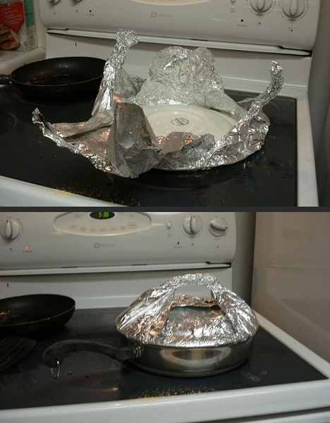 5、没有锅盖但想要焖饭,拿盘子盖住发现不能掀开?没关系,用锡箔纸包住一个盘子并捏出个提手来。