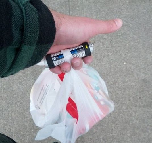 18、塑料袋提重物勒手?找个电池、粗树枝当把手。