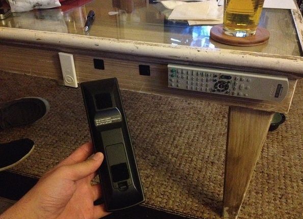 39、看电视发现遥控器找不到了,在沙发里里外外翻来翻去很是头疼脑热?用尼龙粘扣把遥控器放在茶几边上,用的时候找得到。