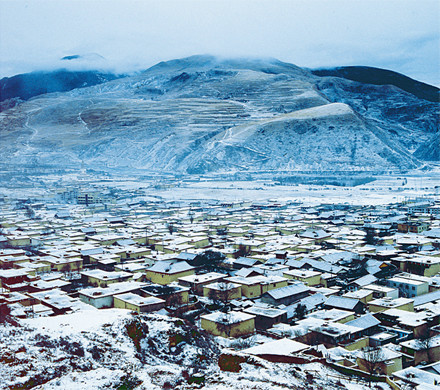 从道孚县这座海拔近3000米的高原城市的高处向下望,首先呈现在视野中的是整齐划一、错落有致的藏式民居。这些民居均是白色的屋顶和主墙,在木结构处涂上棕色颜料,其间配以红色、蓝色图案,显得端庄典雅。宽敞的院坝里,身着艳丽藏装的少女和身着绛红色衣袍的喇嘛穿梭其间。