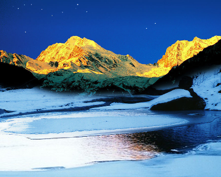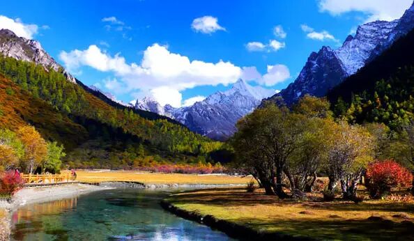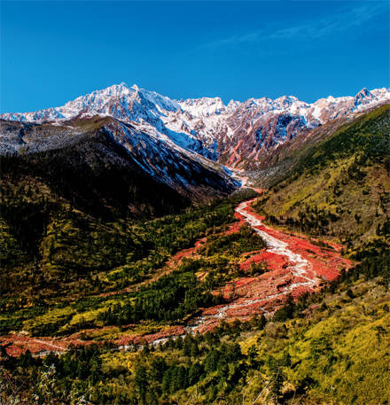 四姑娘山以雄峻挺拔闻名,山体陡峭,直指蓝天,冰雪覆盖,银光照人。山麓森林茂密,绿草如茵,清澈的溪流潺潺不绝,宛如一派秀美的南欧风光,人称“东方的阿尔卑斯”。