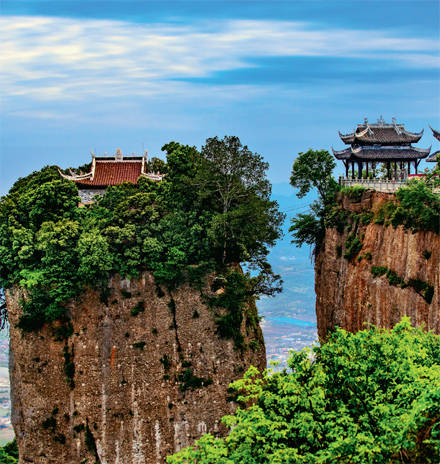 窦圌山位于江油市武都镇涪江东岸,远远望去像一件精雕细刻的盆景,其山不高,海拔1 140米,山形酷似盛放粮食的圆囤,估计这“圌”字便是由此得来。三座石峰,唯西峰有小路可以抵达。东峰和北峰为连体双峰,与西峰对峙,现有铁索相连。铁索铸造于清雍正五年,上下各一根。昔日僧人从铁索上往来于石峰之间,今日有卖艺人来往于铁索上为游人表演。