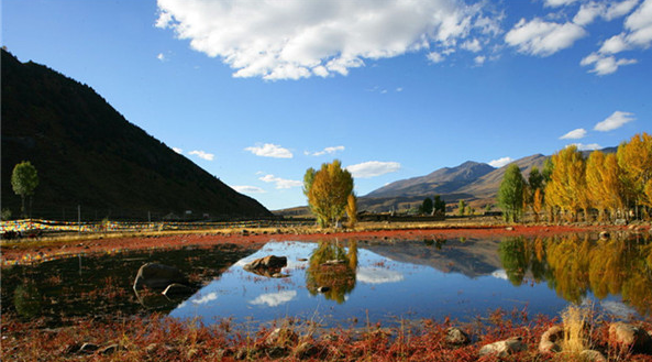 湛蓝清澈的措普湖,孤悬于海拔3 800米处,扎金甲博神山傲立东北,措普寺坐落湖边,这个第四纪冰碛湖既是自然造化的杰作,也是当地人崇仰的圣湖,与世隔绝的湖泊成为高原裸鲤和细鳞花鱼等珍稀动物的栖息之所。