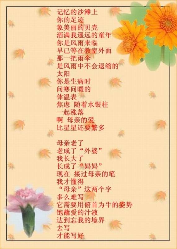 [B][ft=#ff0000,5,楷体_gb2312]没有一种花能比您美丽,没有一种面容比您的慈祥,您还有一个世界上最最好听的名字:妈妈![/ft][/B] [B][ft=#ff0000,5,楷体_gb2312]妹妹说得真好[em]e179[/em][/ft][/B]