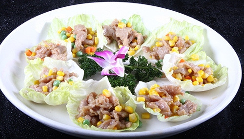 2、肉色不再粉红后,加入0.2茶匙海鲜酱,炖5分钟,以莴苣叶包起来吃。