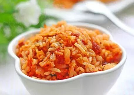 5.再倒入鸡丁,红椒丁翻匀。加入米饭,加一大勺番茄沙司拌匀。