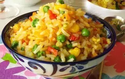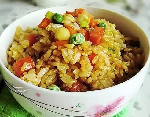2.在锅中放少许油,将青豆、玉米粒、青红椒粒、胡萝卜粒翻炒1分钟,盛起备用。