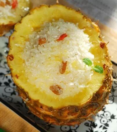 5.将糯米与菠萝粒、葡萄干、枸杞子、糖混合,放入菠萝盅中。