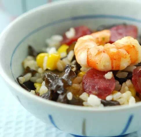 1.腊肠切片,干木耳泡发切小,米饭如果没有隔夜的剩米饭,也可以焖饭的时候少放一点水。