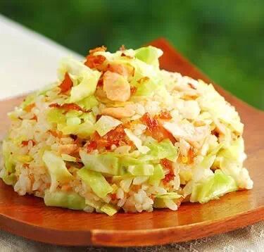 4.往锅中加入米饭,炒散后,加入甘蓝碎与三文鱼碎