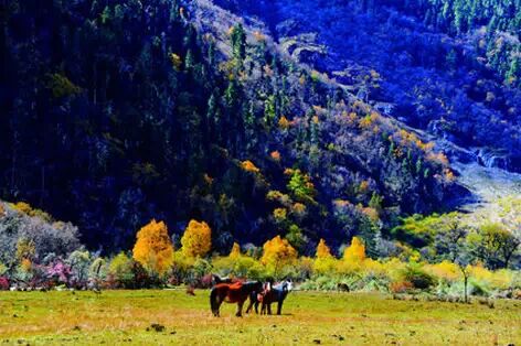 林芝巴松错里面的扎拉沟有一个巨大的牧场,不同海拔带上的植被受气候影响,有的已经变黄落叶,有的却然郁郁葱葱。