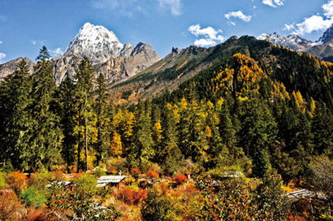 林芝草甸带的两侧是青山密林,青岗、杜鹃、桦树、云衫、高山松自下而上,组成了林海。当秋天来临,层林叠染,青绿、粉红、枫红、深紫,幻出七彩的原始森林群。