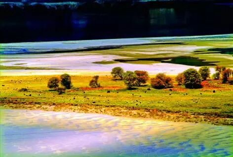 黛色的天空下面如镜的水,水之上又是彩色的田野、树林和人群,恬静的旷野里散发出一种芬芳的气息。在秋风中,西藏竟然是这样千娇百媚。 气温由炎热变凉爽,草色由绿转黄,天高云淡,秋高气爽。