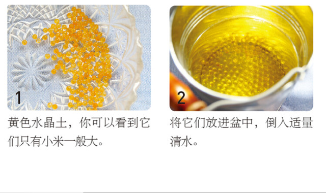 水晶土是一种含有丰富水分和营养的新型土壤。它在干燥状态下只有小米一般大,经过浸泡后却会变大好多倍。市面上卖的“水晶泥”、“彩色土”都属于水晶土。这种土用起来和清水差不多,平时无须浇水,只要在栽种之前将植物根部的土壤清洗干净、每天记得用喷雾器喷一些水,保持土表湿润即可。不过,有一点需要格外注意:不要让底部长期积水。