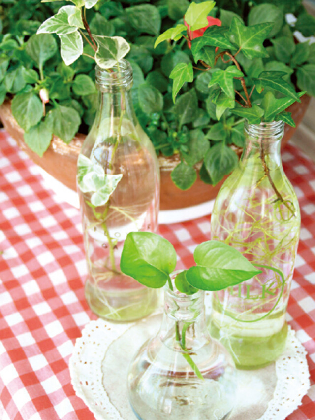 装咖啡或花茶的玻璃瓶总是非常美貌。如果我们再为它们加上铁丝做的把手,那就更是“美不胜收”了。要是再用它们来水培绿色植物,那真是“清新得一塌糊涂了”。我们可以在水中放几块木炭,以省去经常换水的麻烦,达到净化水质的效果。记得瓶中水量减少时要及时进行补充哦!
