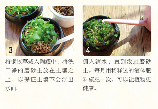 水培也可以与土培相结合。将土壤铺在陶罐底部,再装上适量的清水,这样土中丰富的营养物质就会更好地帮助植物成长了。最适合用这种方式栽培的植物莫过于铜钱草。铜钱草生命力十分旺盛,不需几天就能成倍增长。记得当罐中清水减少时,要及时补充。