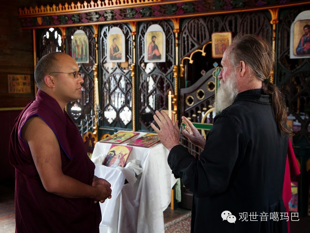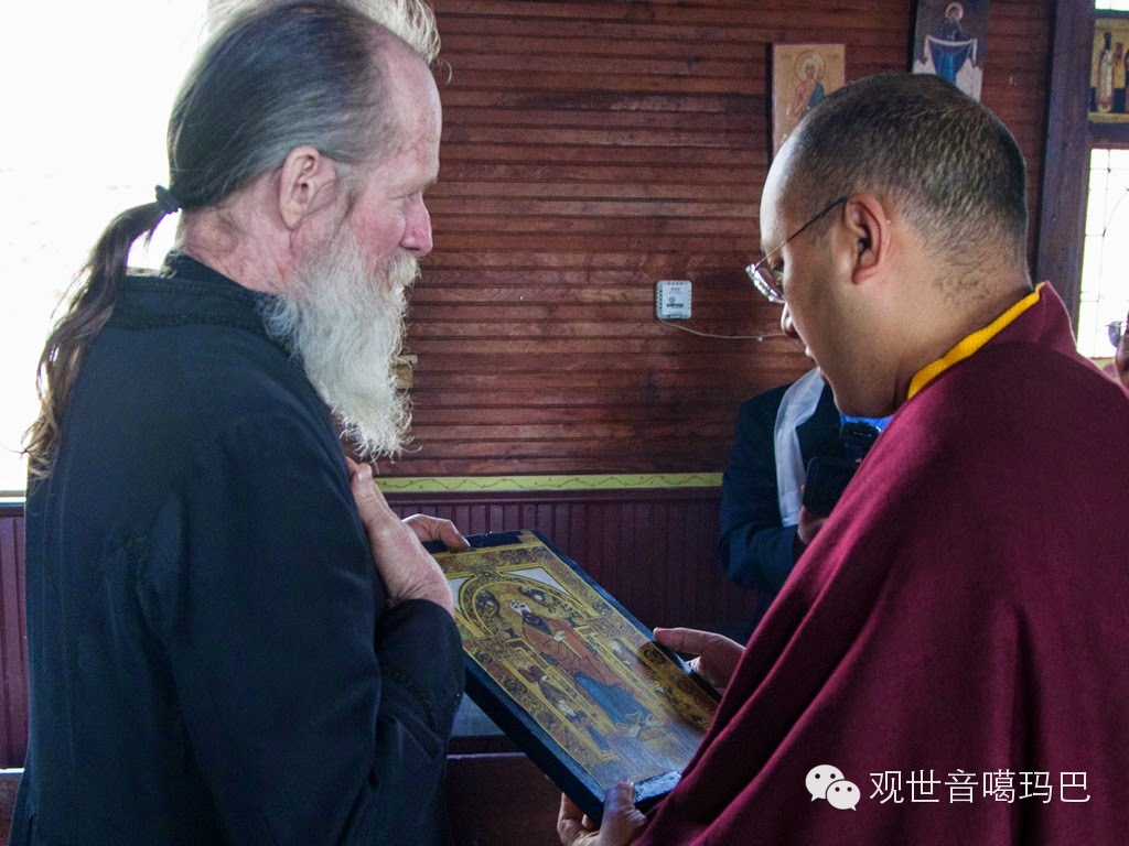 法王受到约翰.尼尔森神父的热烈欢迎,并在这座只有一个厅室的西仪东正教教堂中参观圣物。对于世界上这两个古老的精神修持传统在山间比邻而居,约翰神父为此感到欣慰。法王和约翰神父轻声交谈,分享彼此对世界神圣领域的体验。