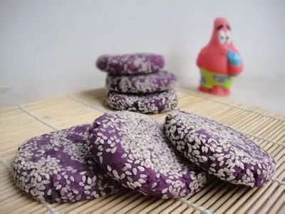 2、用勺将紫薯捣成泥,搓成丸子,再压成饼;