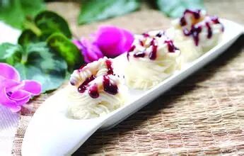 4、蓝莓酱加适量清水和蜂蜜调和均匀,一点要充分搅拌均匀,淋在山药泥上。