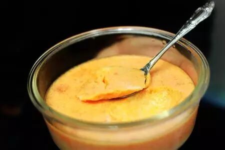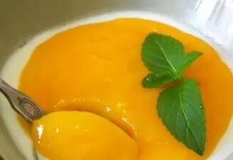 5、芒果打成泥,浇在放凉的双皮奶上,冷藏后更爽滑哦。