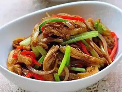 2. 锅内烧热油,先放葱姜炒香,再放干辣椒炒香,倒入撕好的鸡肉,炒匀,加少许生抽和盐,关火放入芹菜翻匀。