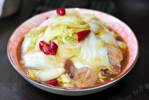 白菜 400克、五花肉 适量、葱 1段、干辣椒 1小把、白糖 2小勺、陈醋 2大勺、食盐 1/2小勺、淀粉 1小勺、水 2大勺、花生油 2大勺