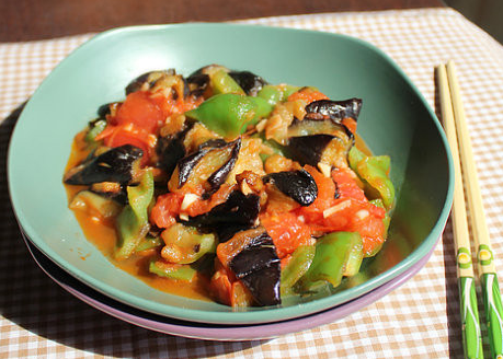 茄子 2条、柿子椒 1个、西红柿 1个、蒜 4瓣、食盐 适量、白糖 适量、花生油 适量