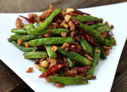 四季豆 300克、猪肉馅 30克、生抽 1汤匙、料酒 1/2汤匙、干辣椒 8个、花椒 15粒、蒜 4瓣、姜 1片、食盐 1茶匙、白糖 1/2茶匙、鸡粉 1/2茶匙、植物油 4汤匙