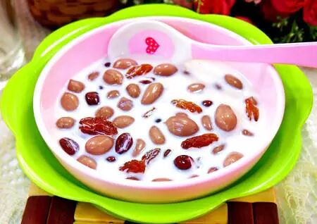 食材:红豆200g、花生100g、纯牛奶1盒、蜂蜜适量、冰糖适量、提子干适量