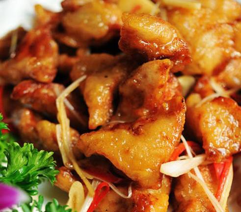 2、勺内加花生油烧至120℃左右时将里脊投入油中炸至断生捞出,待油温升至180℃左右时再将里脊入油一促,倒入漏勺内控净油。