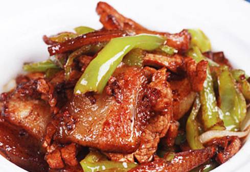 3、待五花肉煎至黄色时,将切好的尖椒和蒜片放入,继续翻炒。很多做法中会把五花肉盛出,这里不需要;