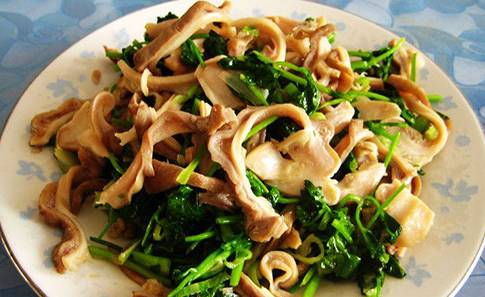 4、起锅放油烧热,放葱丝、蒜片爆香,加入肚丝翻炒,加入料酒、盐、姜汁、味精、醋,最后放胡椒粉、香菜,淋少许香油翻炒,出锅装盘即可。